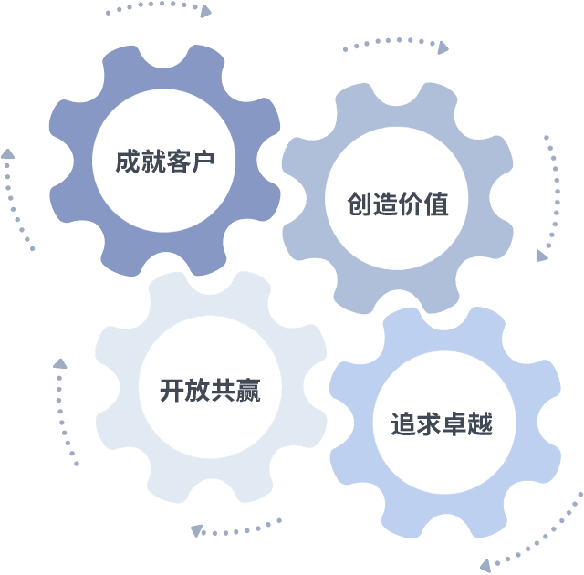 成就客户是一切决策的出发点,,,,创造价值是衡量所有工作的标准,,追求卓越是我们做事做人的态度,,,开放共赢是我们的格局也是最终的结果。。价值观的齿轮环环相扣,,,,推动着组织里的每个人不断向前。。。