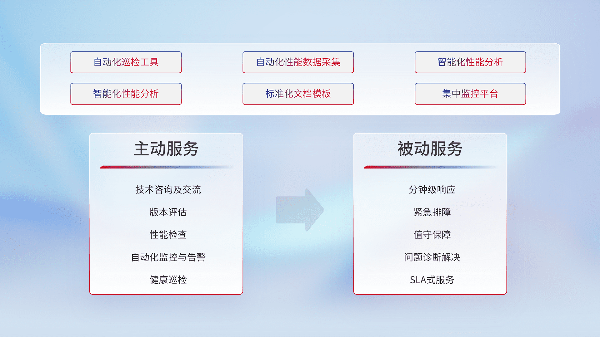 智能化工具和标准化文档,,保障服务质量,,提供主动服务(包含技术咨询、、、、版本评估、、、、性能检查、、、自动化监控与告警、、、、健康巡检)和被动服务包含(分钟级响应、、紧急排障、、、值守保障、、问题诊断解决、、、、SLA服务)。。